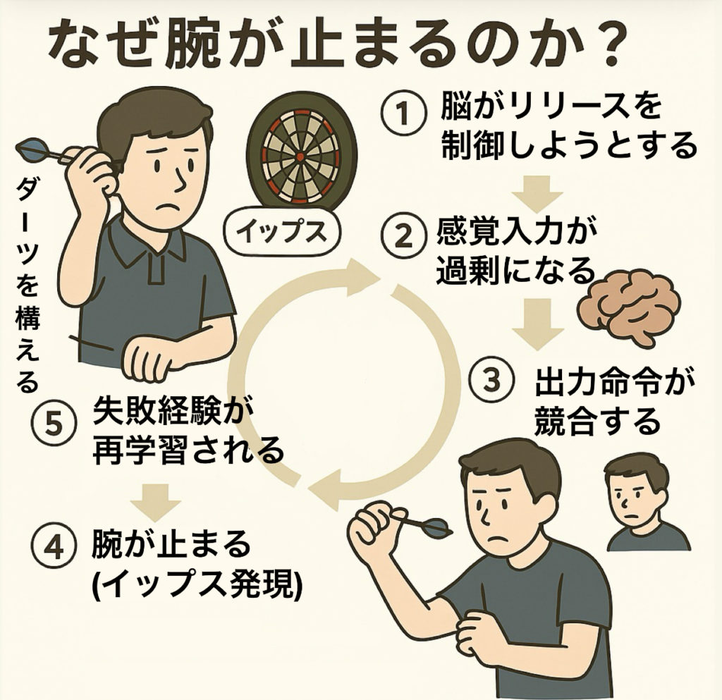 医学的には一部が「局所性ジストニア」として神経疾患に分類されますが、ダーツにおいて多く見られるのは「誤学習型イップス」と考えています。